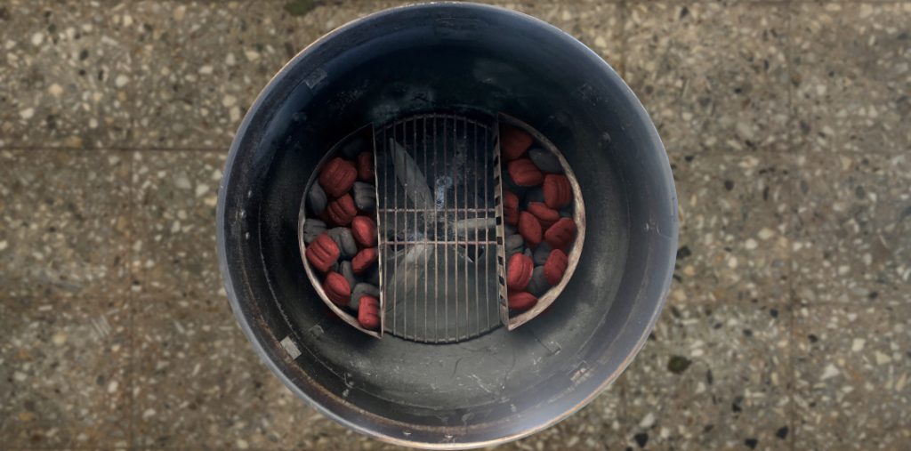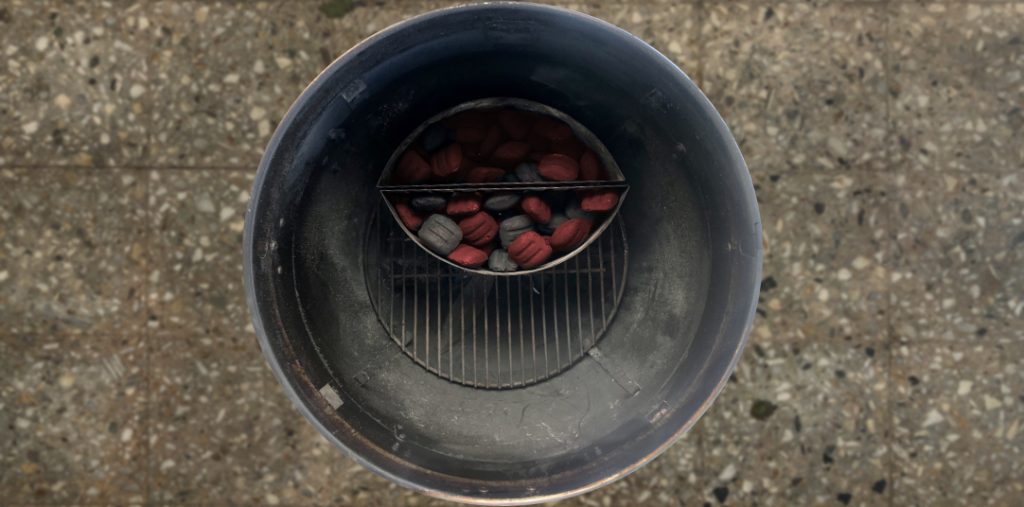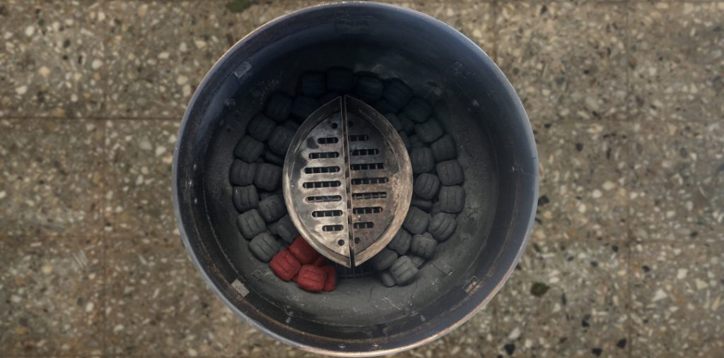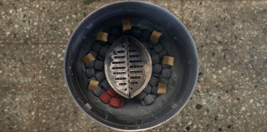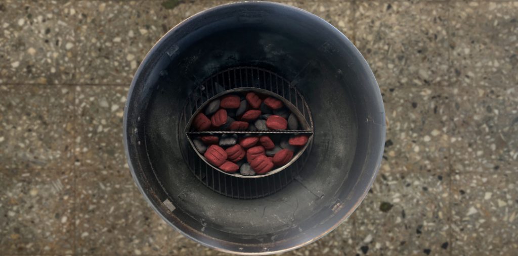 Due file di bricchette a doppio strato vengono posizionate lungo l’esterno, con o senza pezzi di legno, e all’inizio sono accese solo poche braci ardenti che accenderanno lentamente il resto della catena nel corso di molte ore di cottura.