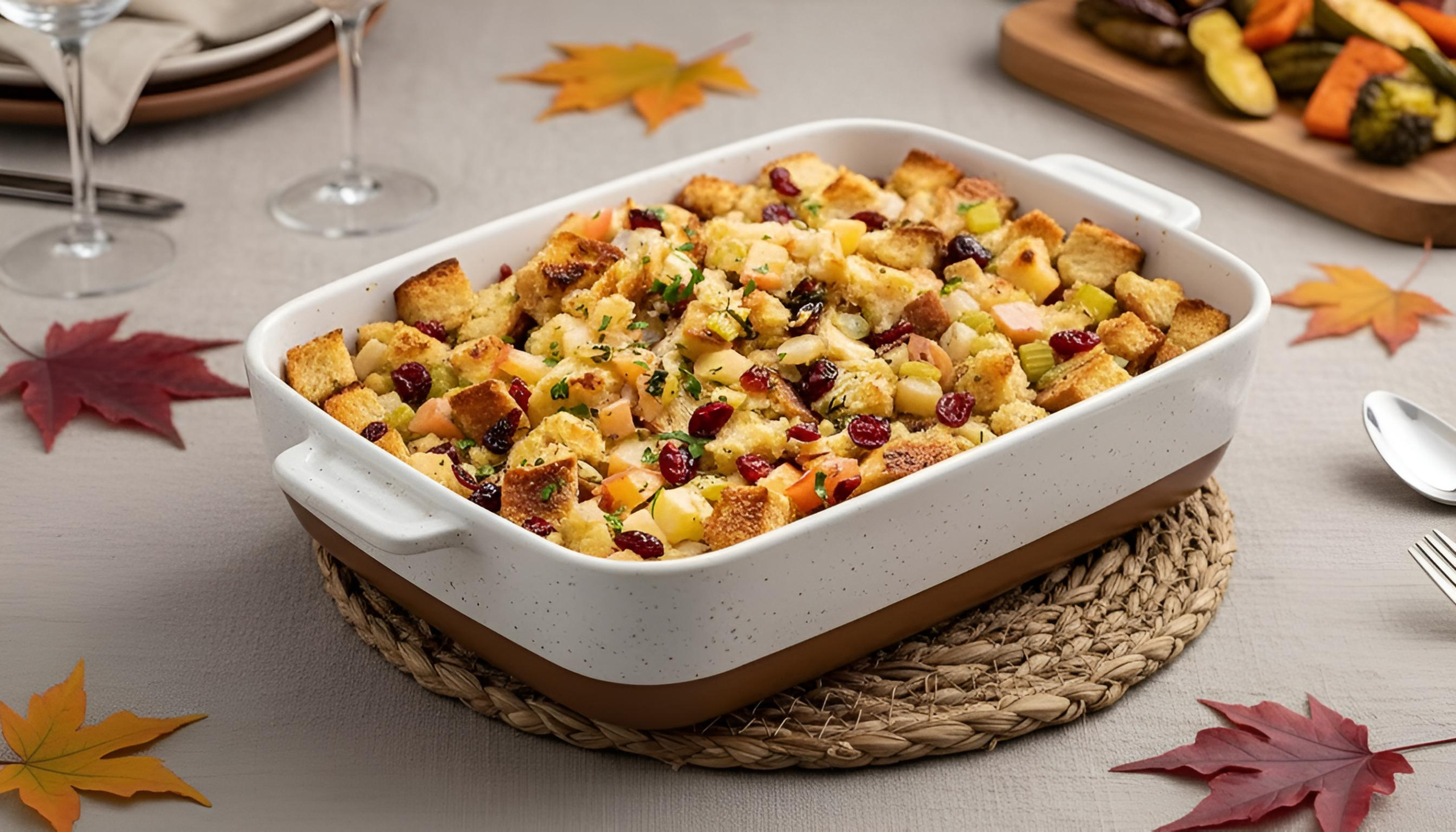 Questo piatto è un classico delle feste americane, ma con un tocco personale — la dolcezza delle mele e dei mirtilli rossi si sposa con l’aroma delle castagne e del rosmarino, creando un equilibrio perfetto tra dolce, sapido e autunnale.